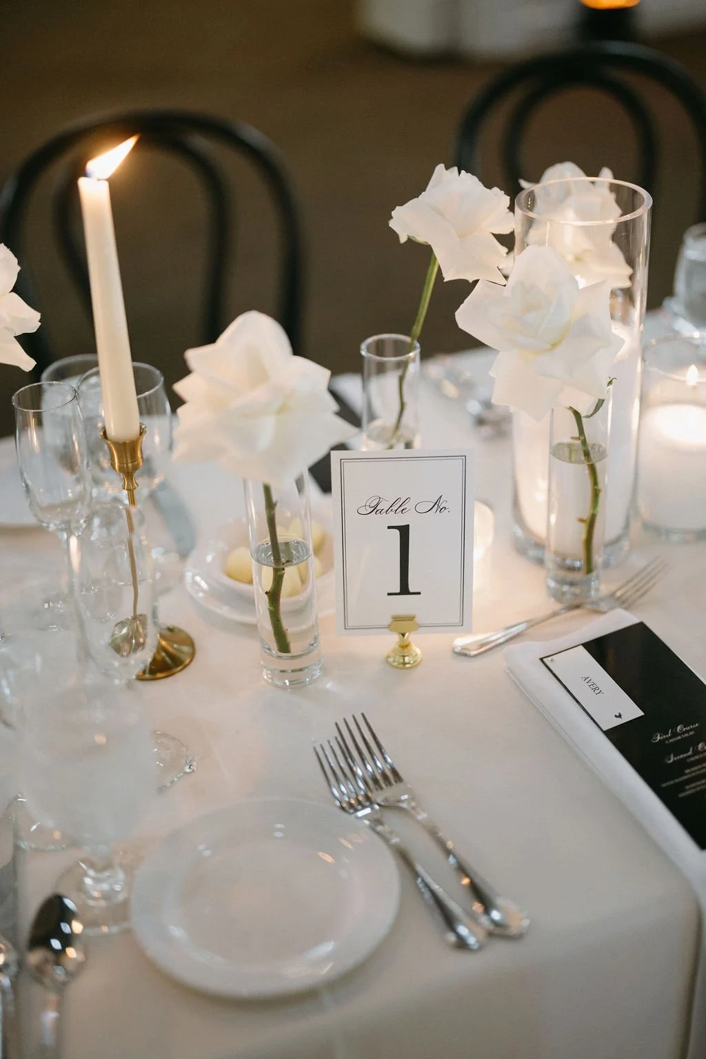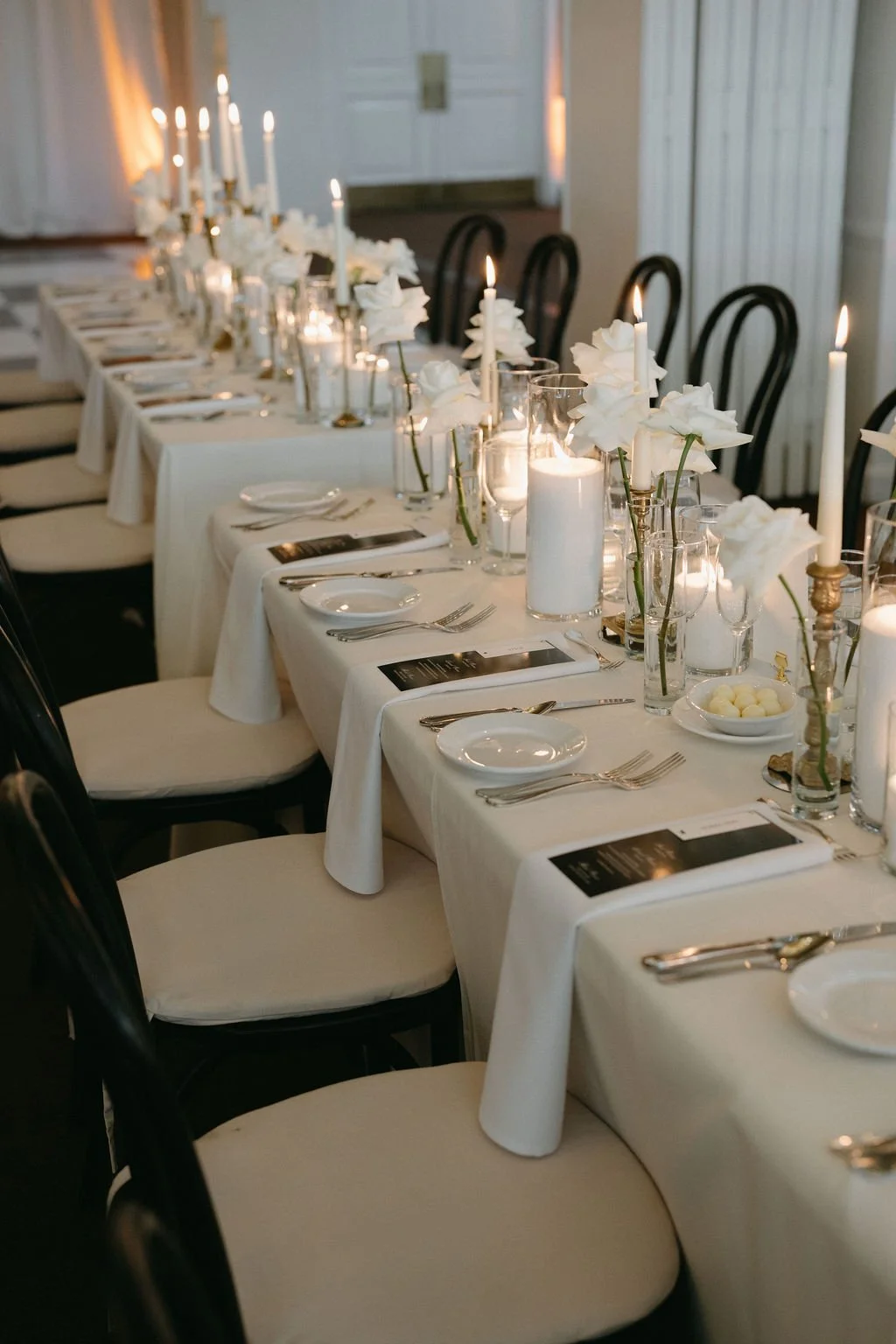 Working closely with Event Designer Kimberly Thiesen, the planning and design team translated Morgan’s vision into a cohesive black-and-white palette that felt timeless rather than trendy—elevated by texture, candlelight, and intentional layout choices.