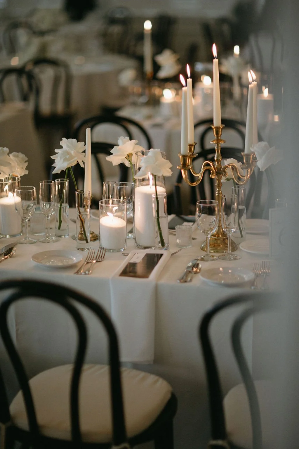 Long tables dressed in crisp white linens, paired with black chairs and surrounded by hundreds of glowing candles, created a romantic and welcoming atmosphere that encouraged connection.An Intimate Champagne Tower: